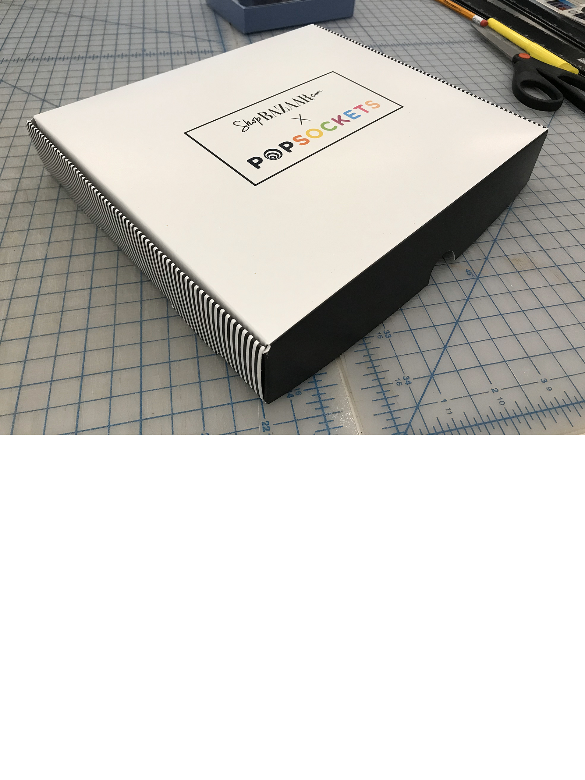 Design of packaging for a limited edition ShopBazaar.com x Pop Sockets collaboration with Harper's Bazaar editors